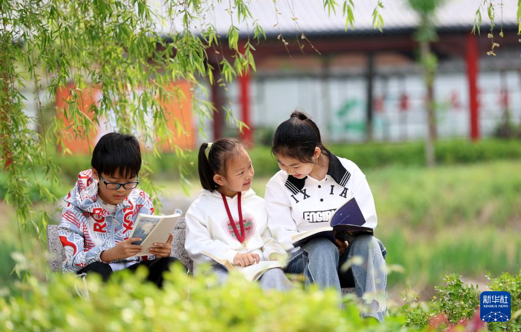4月21日,山東省臨沂市郯城縣郯城街道東南村的孩子們在村公園讀書。