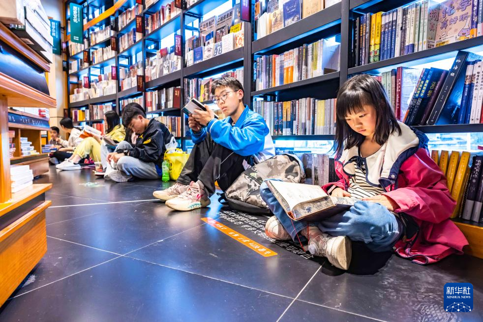 4月21日,小朋友在貴州省安順市西秀區一家書店內閱讀。
