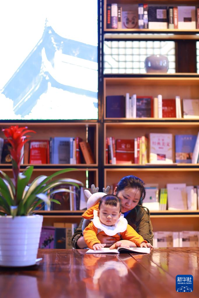 4月21日,在貴州省黔南布依族苗族自治州都勻市崇實書院,一名家長帶著孩子閱讀圖書。