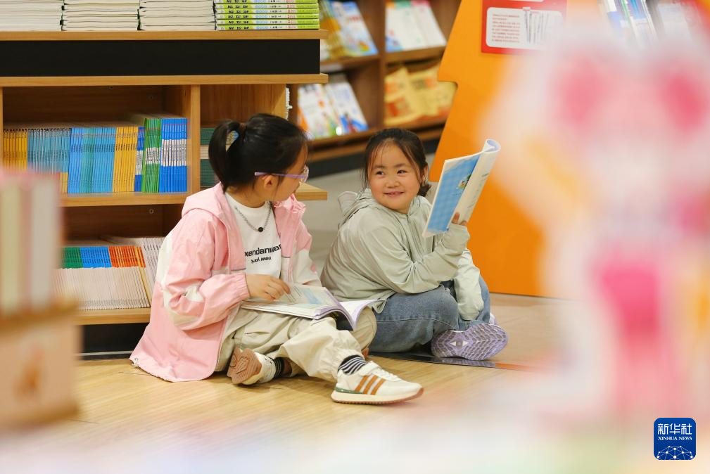 4月21日,兩名小朋友在山東省滕州市新華書店內交流。