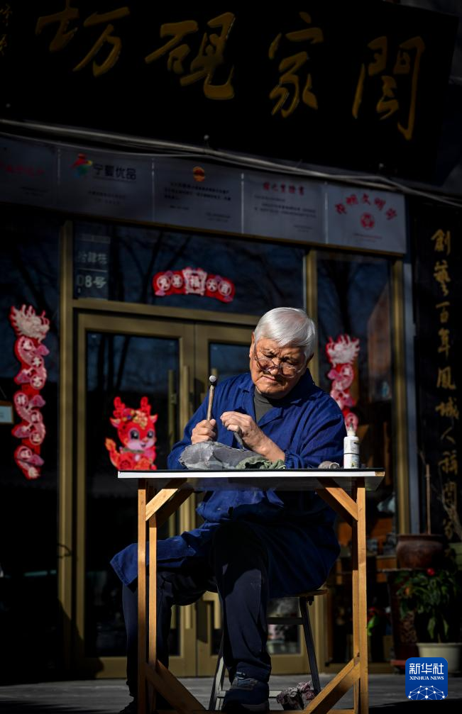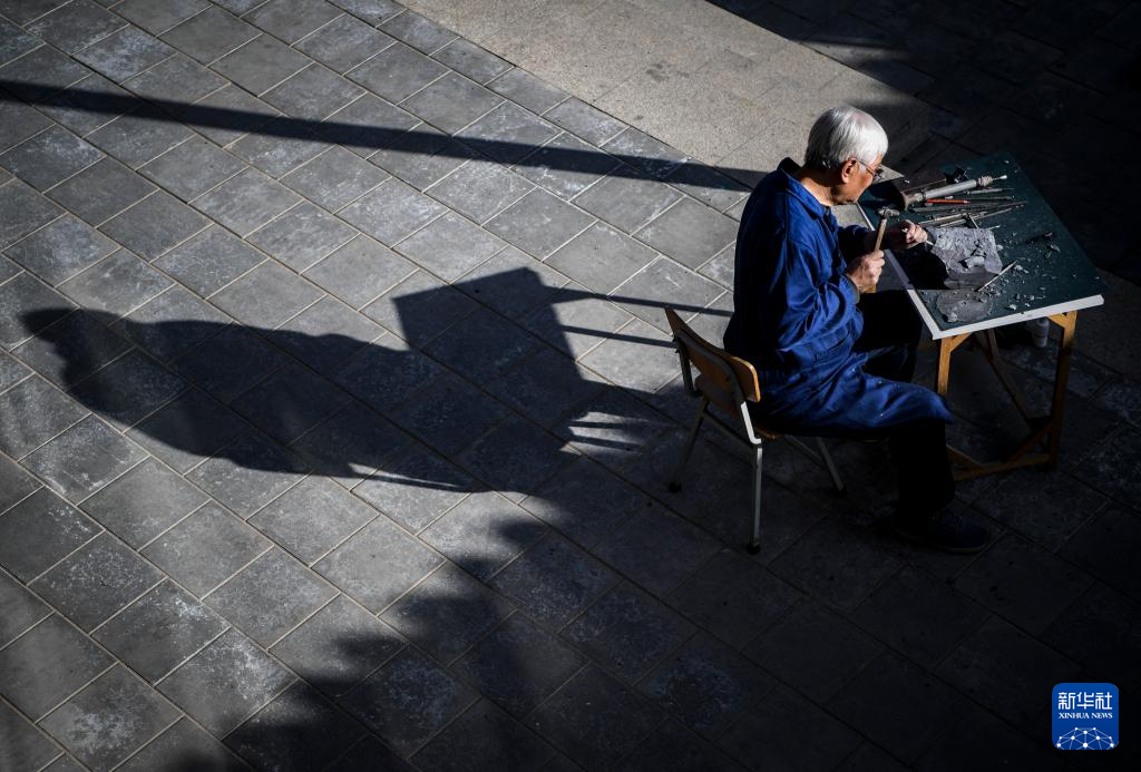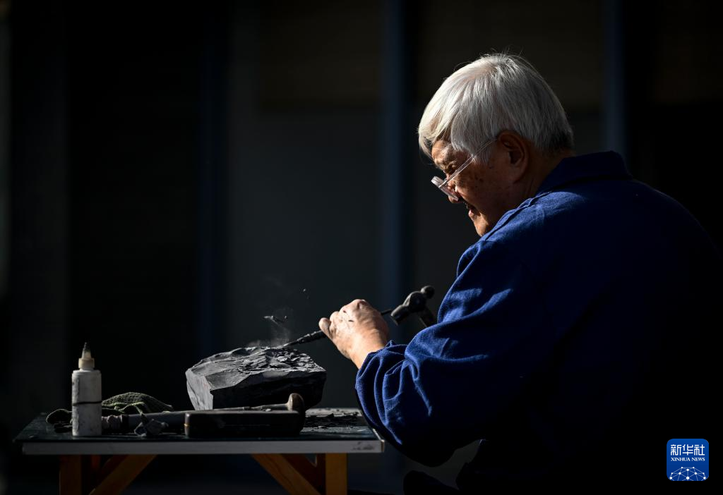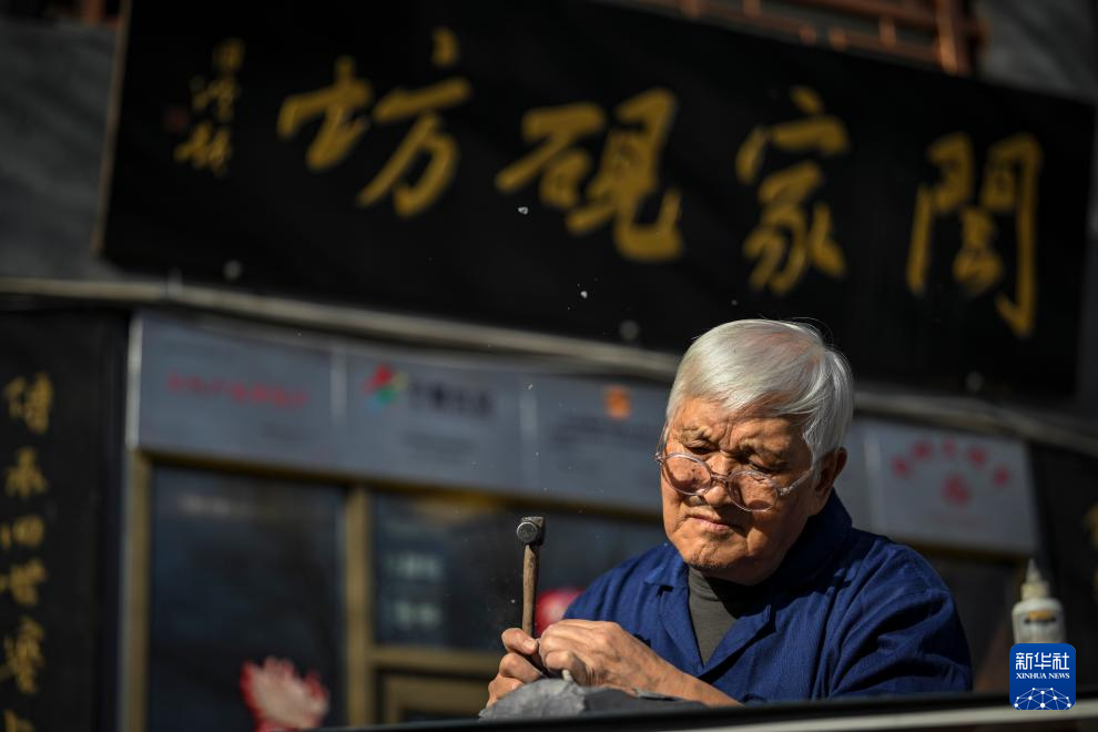 步入銀川文化城,古色古香的建筑下,一位滿頭銀發的老人在陽光下“叮叮當當”,對著一塊賀蘭石精雕細琢——他就是鉆研賀蘭硯雕刻技藝50多年的國家級非遺傳承人閆森林。