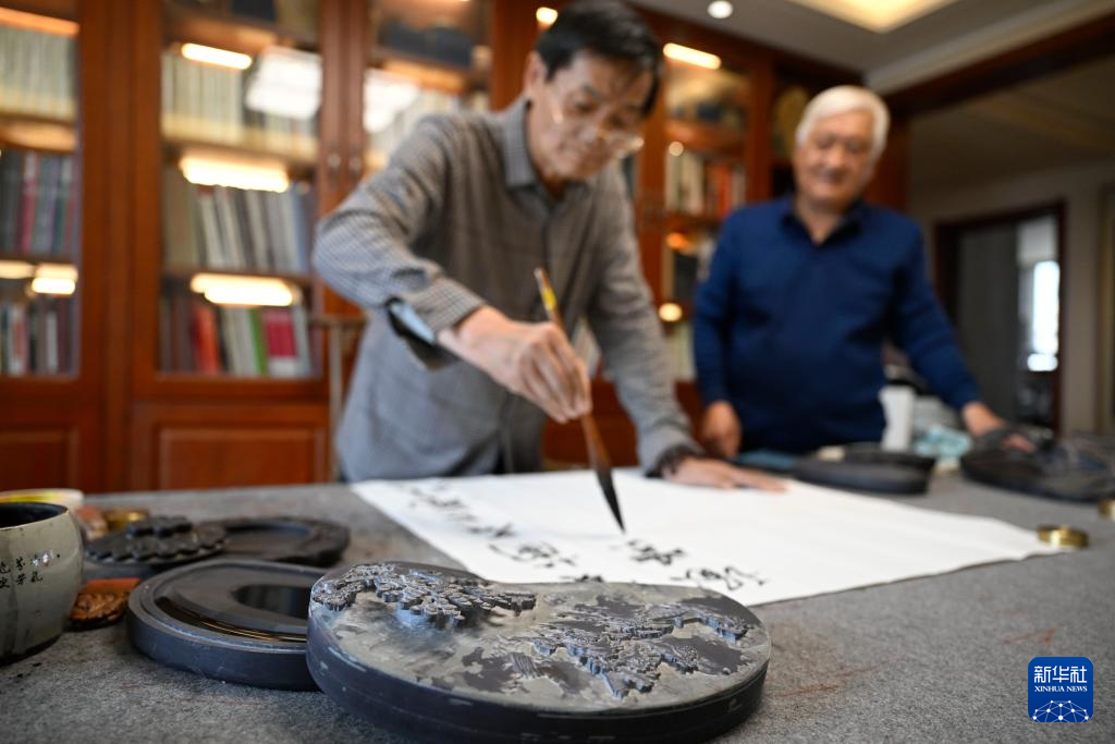 閆森林的好友、書法家陳國鴻(左)在書房練字,他常用的硯臺是賀蘭硯(4月15日攝)。
