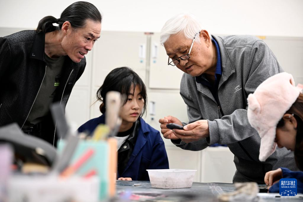閆森林(右二)和徒弟蔣喜文(左一)在給寧夏藝術職業學院學生講解賀蘭硯制作技藝(4月15日攝)。