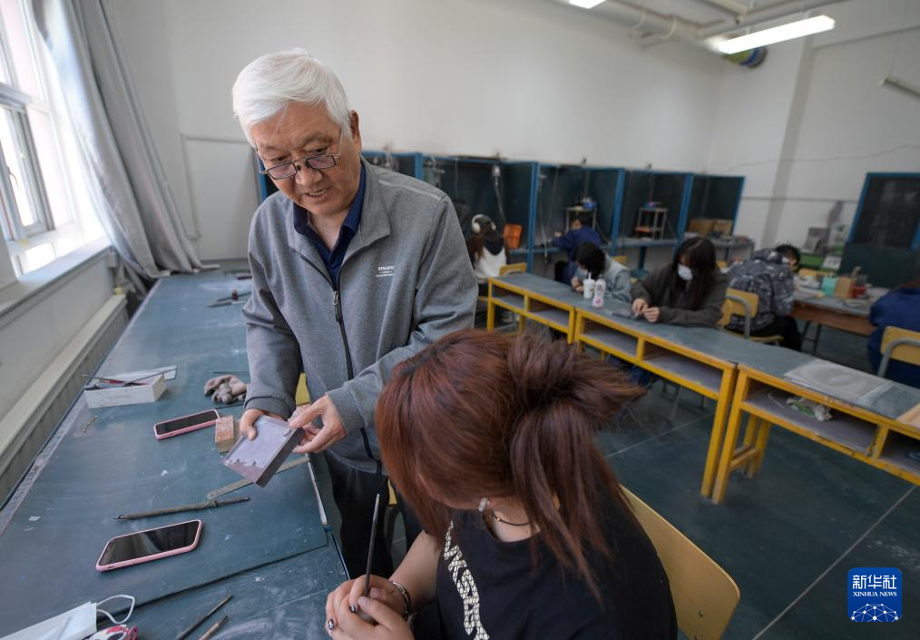 在寧夏藝術職業學院,閆森林為學生講解賀蘭硯制作技藝(4月15日攝)。