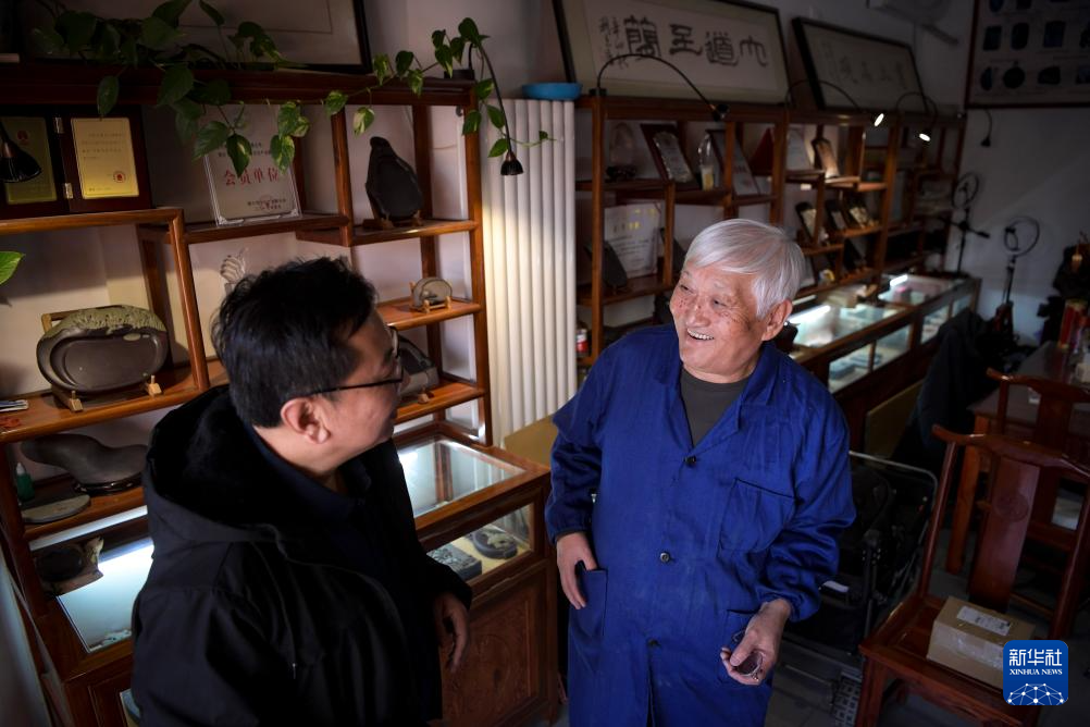 閆森林(右)在工作室向顧客介紹賀蘭硯(3月8日攝)。