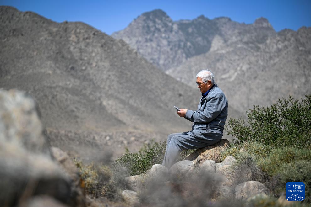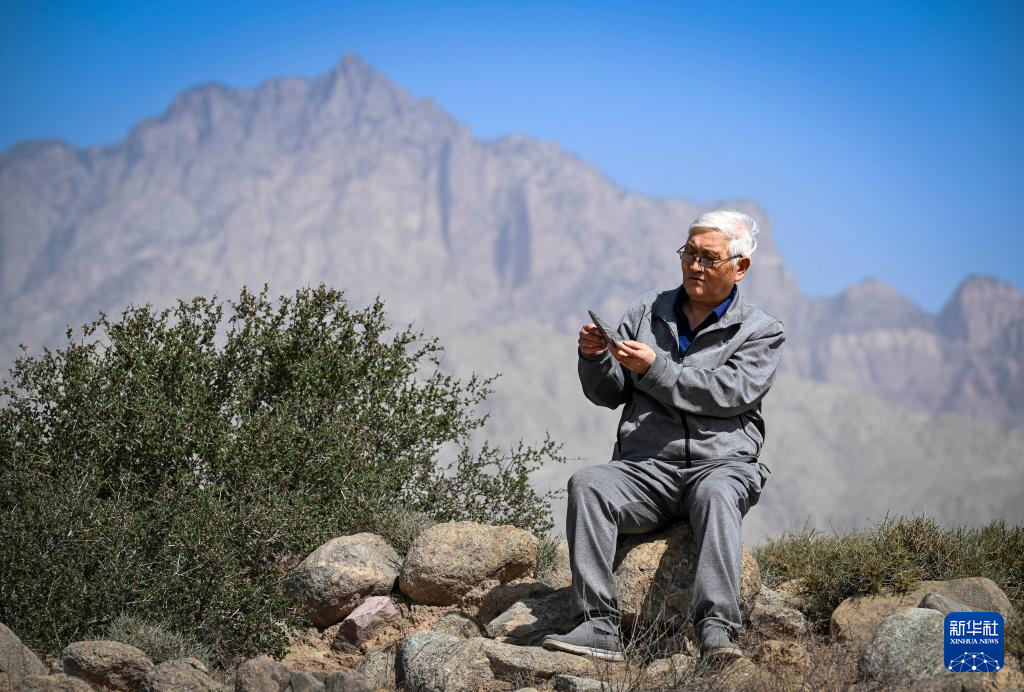 閆森林在賀蘭山下品鑒賀蘭石,為創作賀蘭硯尋找靈感(4月15日攝)。