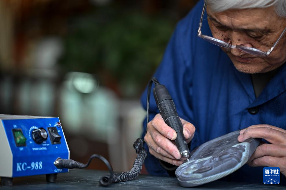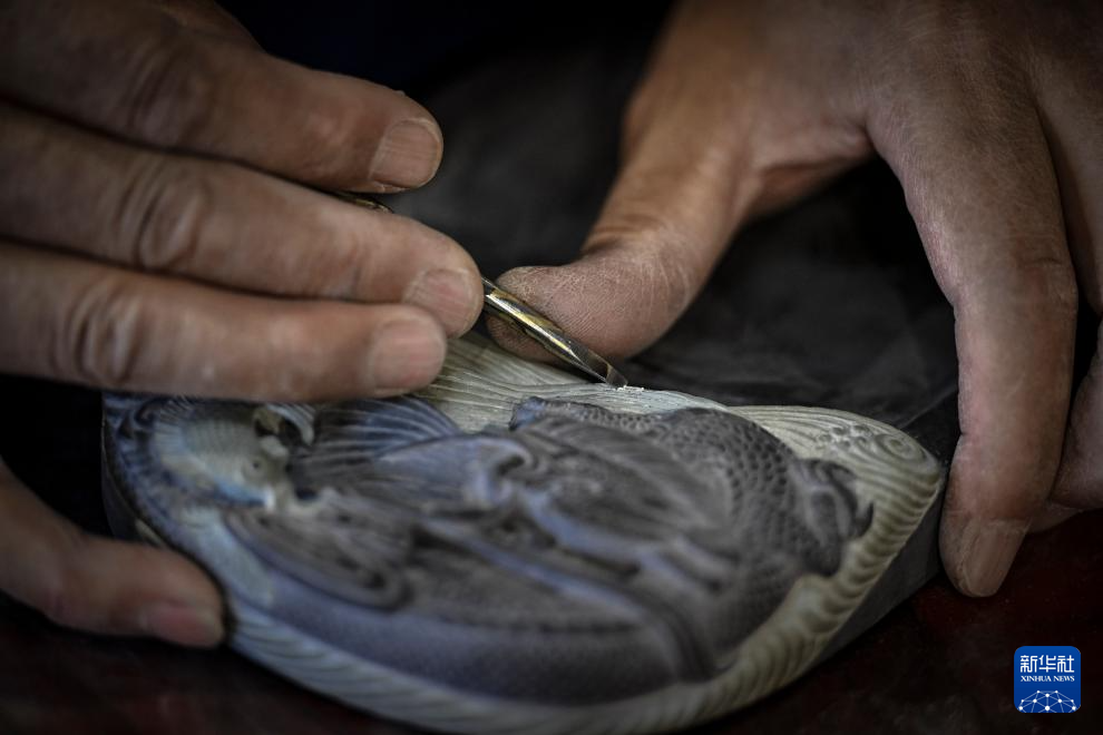 閆森林在用雕刀雕刻一方硯臺上的浪花紋樣(3月8日攝)。