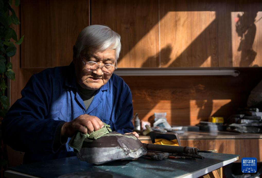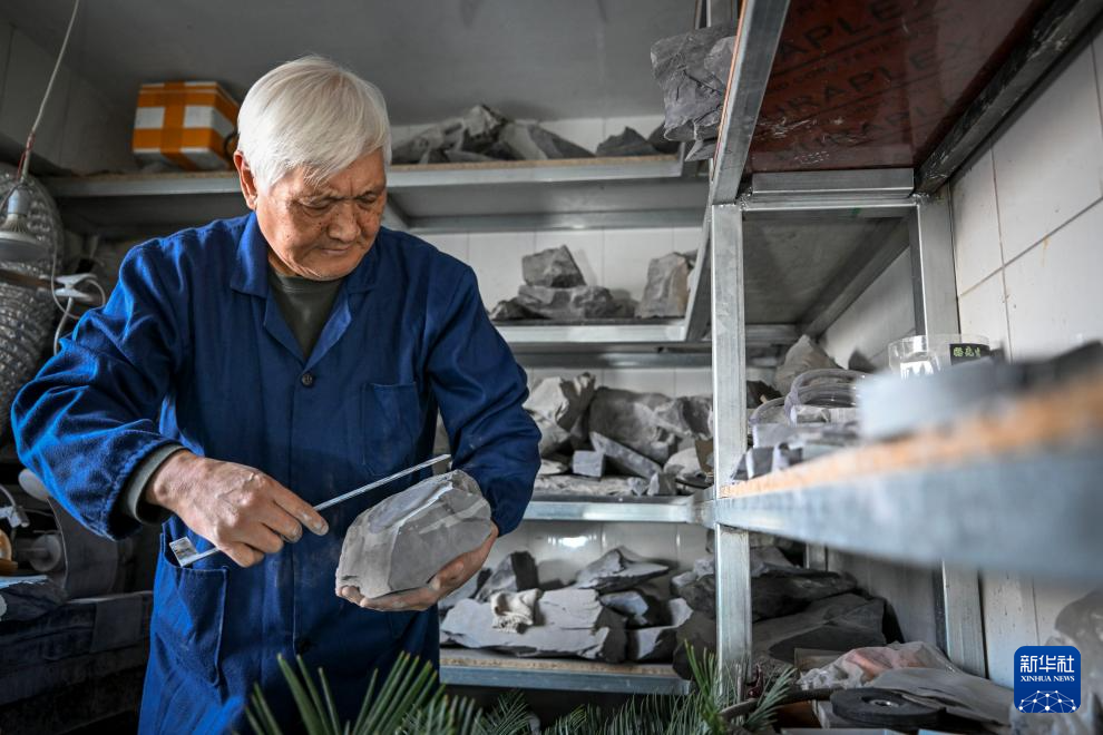 閆森林在工作室擦拭用來制硯的賀蘭石(3月8日攝)。