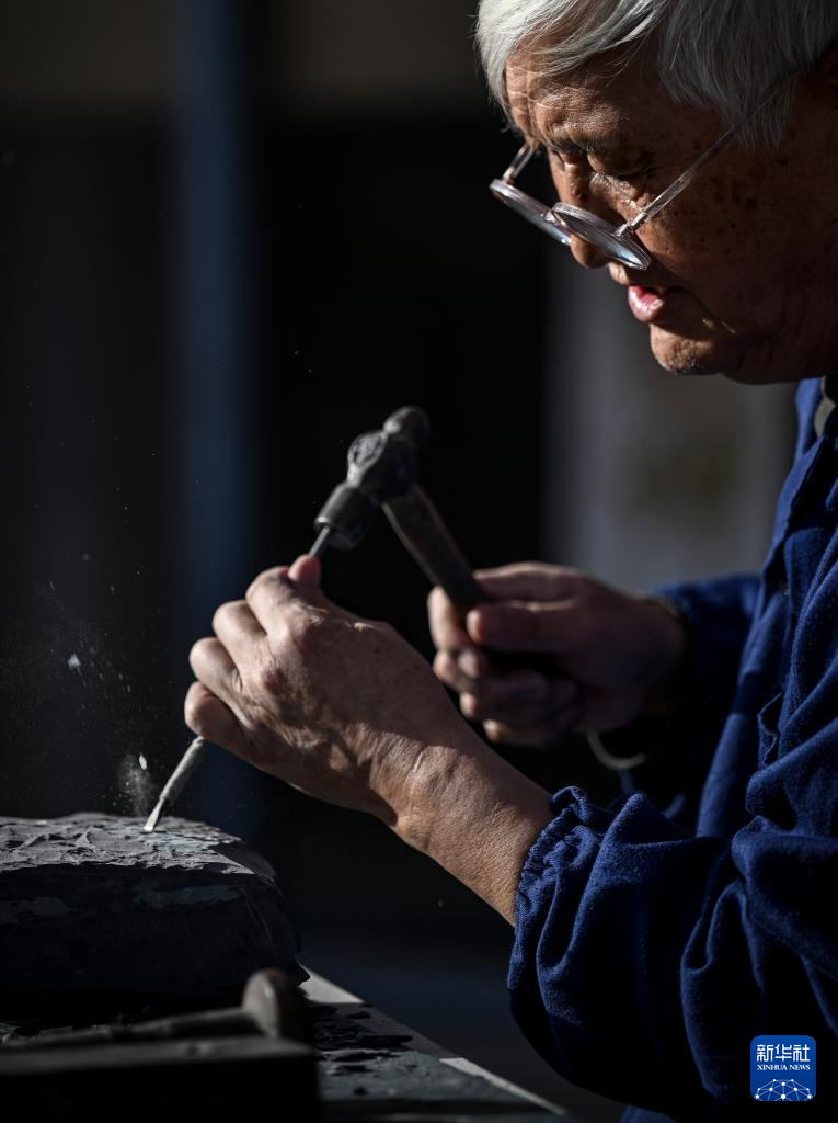 閆森林在工作室使用敲刀打硯坯(3月8日攝)。