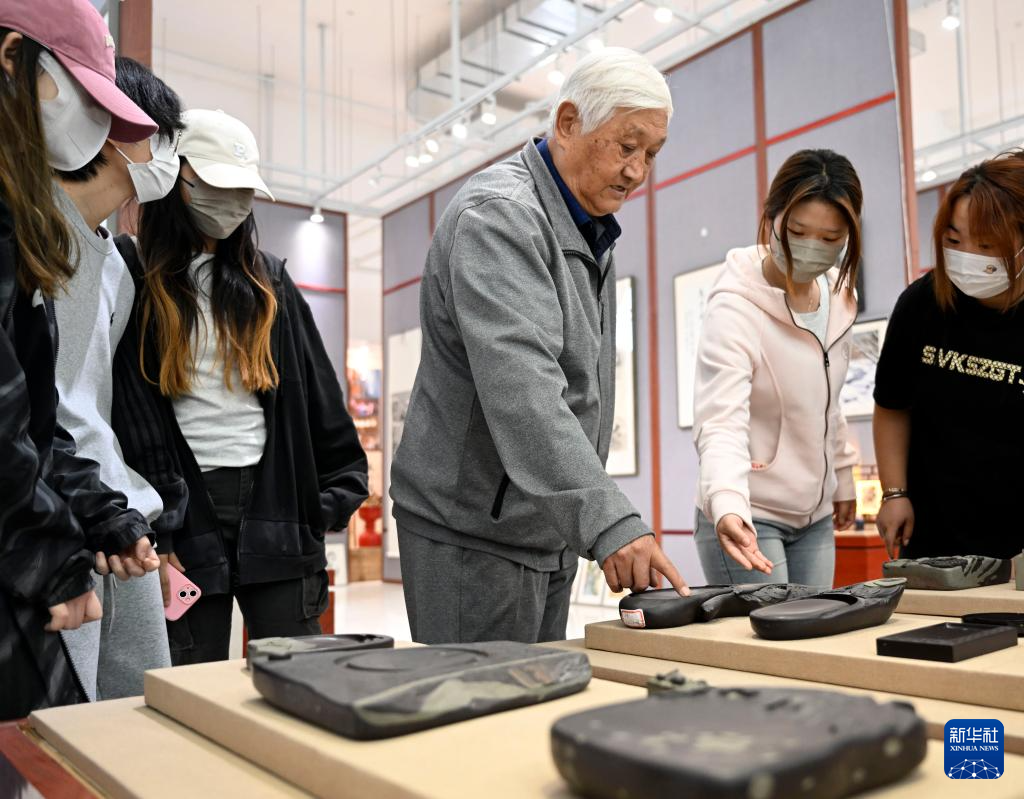 閆森林(中)在給寧夏藝術職業學院學生介紹賀蘭硯作品(4月15日攝)。