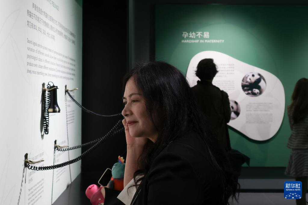 4月22日,在大熊貓國際文化交流中心,參觀者體驗互動裝置,聽大熊貓不同狀態下發出的聲音。