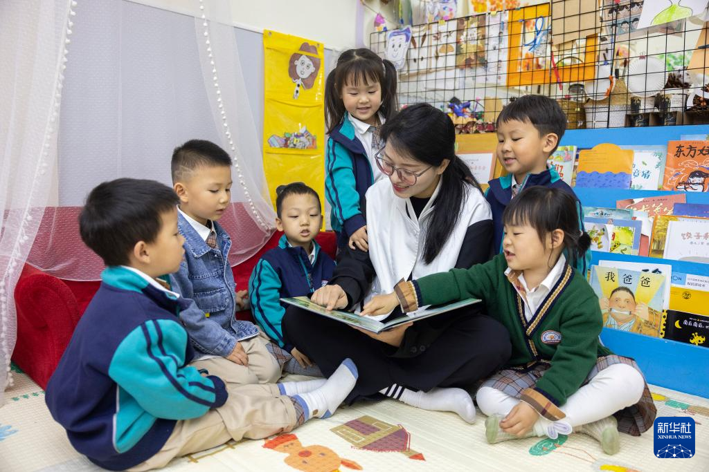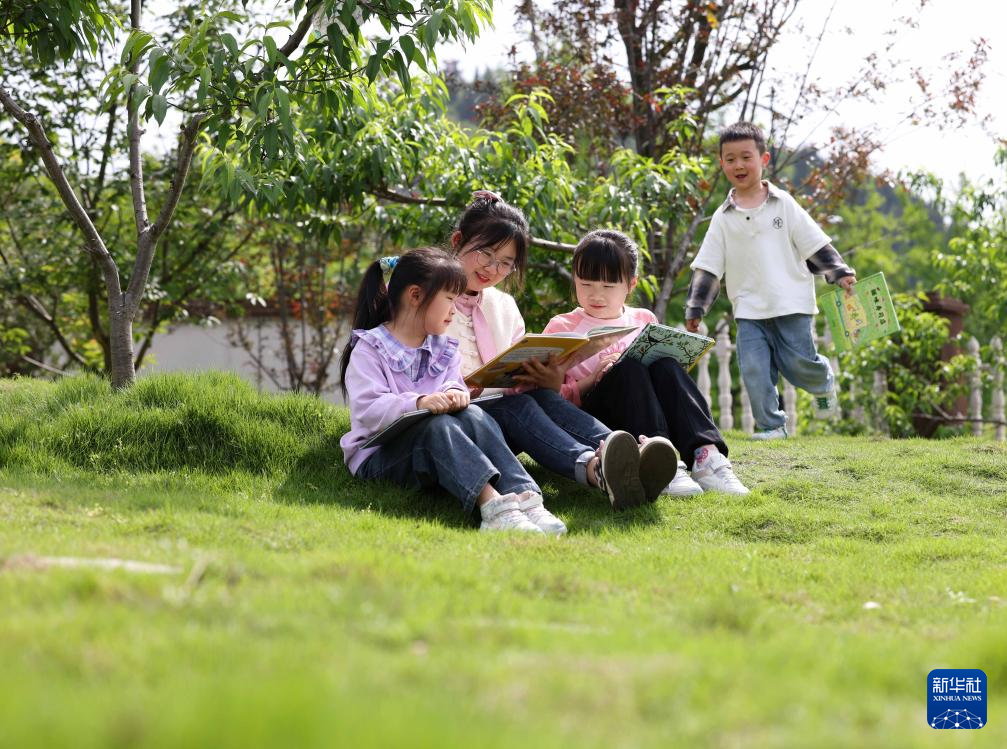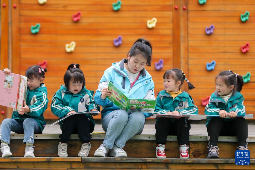 4月23日,貴州省開陽縣第二幼兒園的教師帶領小朋友在校園內閱讀繪本。