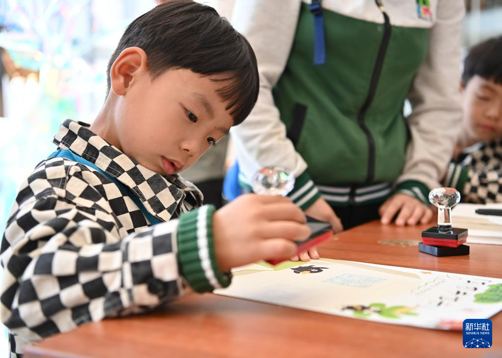 4月23日,一名小朋友在山西省圖書館開展的閱讀推廣活動中集章打卡。