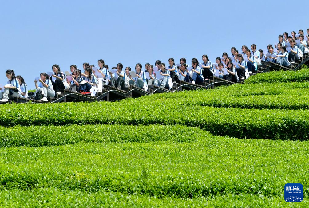 4月23日,湖北省宣恩縣中等職業技術學校的學生在萬寨鄉伍家臺村的茶園棧道上集體誦讀經典。