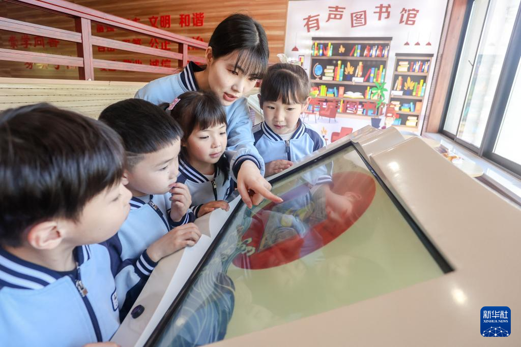 4月23日,在浙江省湖州市長興縣龍山街道玄壇廟農家書屋,龍山街道幼兒園的孩子們在體驗電子有聲閱讀。