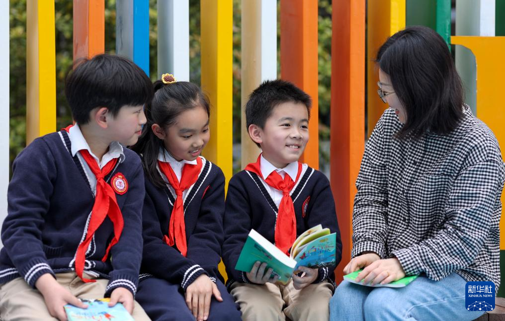 4月23日,在浙江省嘉興市三水灣小學“讀書角”,老師帶領孩子們閱讀圖書。