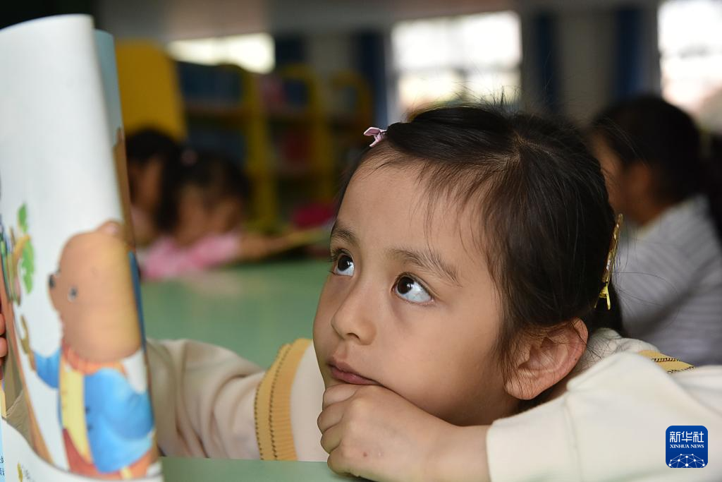 4月23日,在山東濰坊高密市金蘋果幼兒園,一名小朋友在閱覽室里閱讀繪本故事。