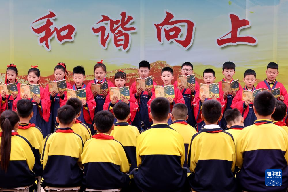 4月23日,在山東省棗莊市光明路街道沙河子小學,學生在讀書日主題活動上誦讀國學經典。