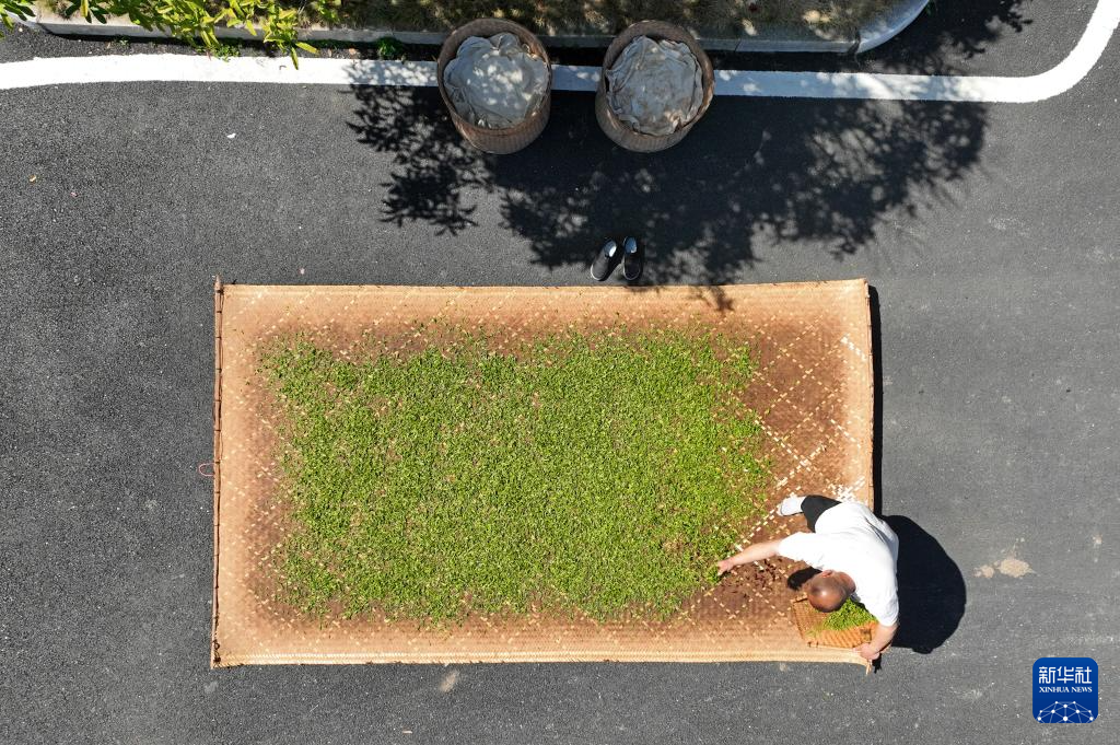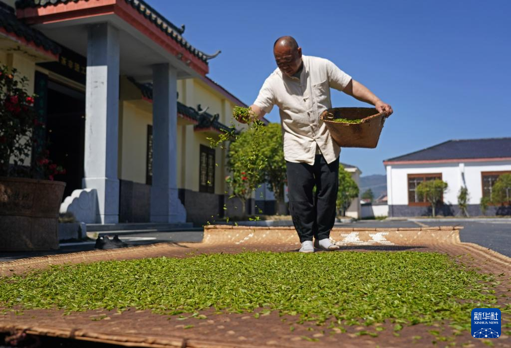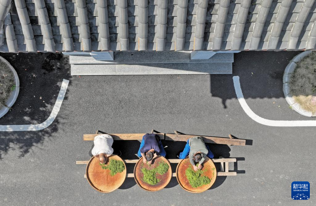 江西省修水縣漫江鄉的寧紅茶制茶基地,俞旦華對茶葉進行傳統萎凋工序(3月29日攝,無人機照片)。