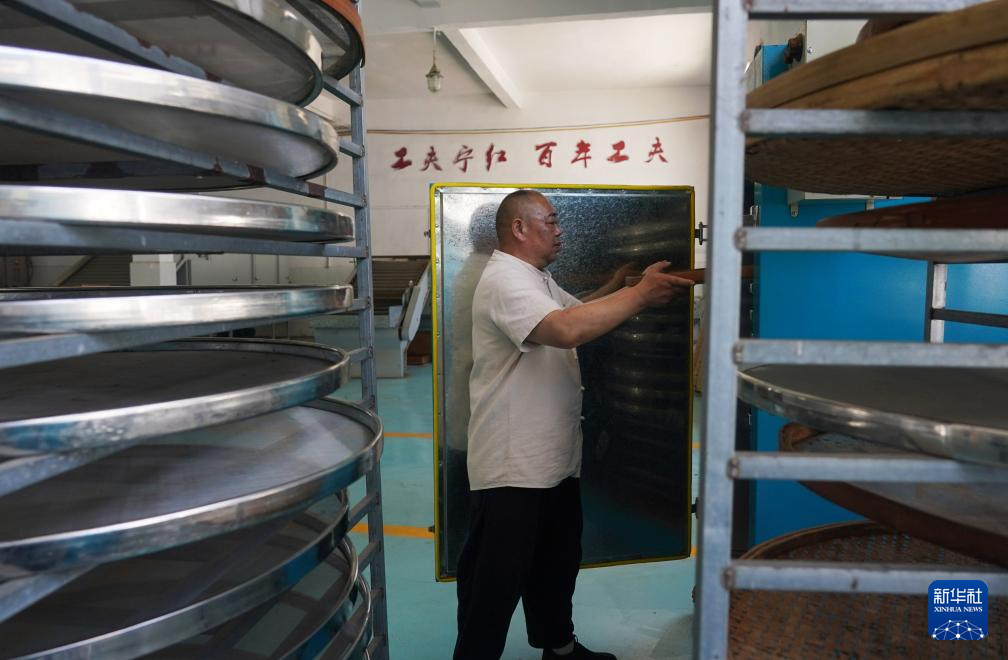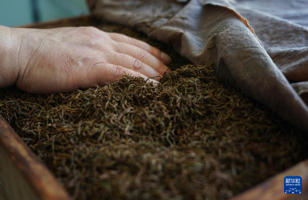 江西省修水縣漫江鄉的寧紅茶制茶基地,俞旦華對茶葉進行傳統萎凋工序(3月29日攝)。