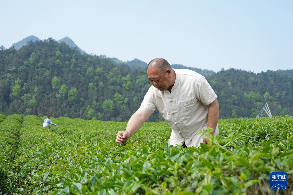 江西省修水縣漫江鄉的寧紅茶制茶基地茶園中,俞旦華查看茶葉生長情況(4月24日攝)。