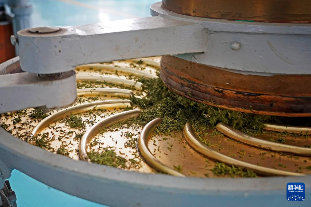 江西省修水縣漫江鄉的寧紅茶制茶基地,揉捻設備對茶葉進行機械化揉捻(3月29日攝)。