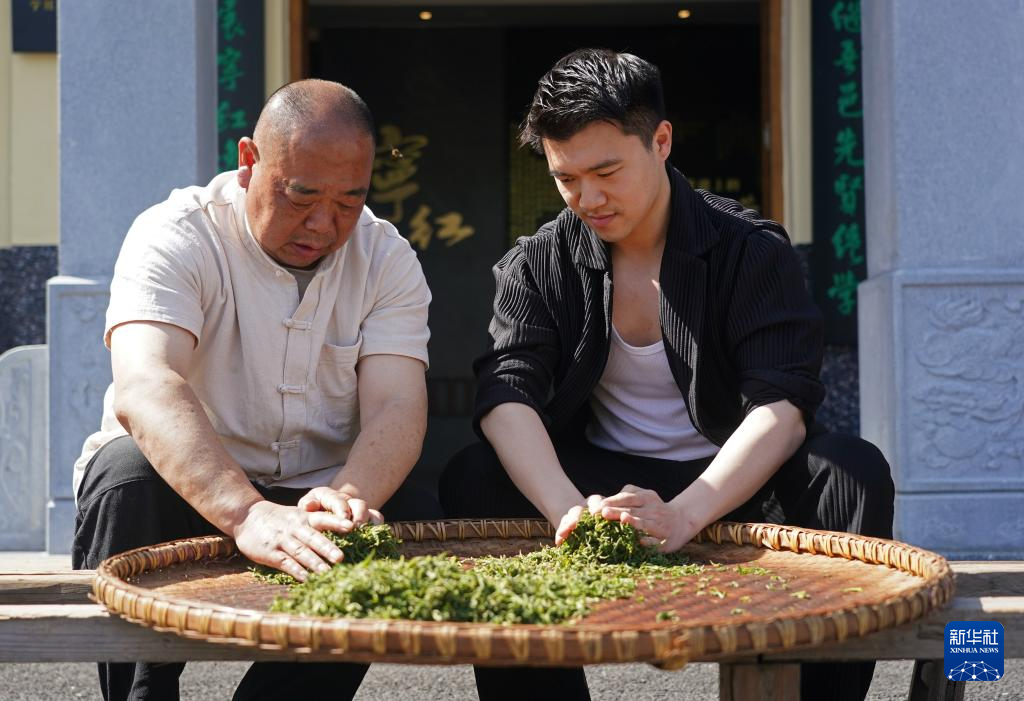 江西省修水縣漫江鄉的寧紅茶制茶基地,俞旦華(左)向青年員工展示傳統的揉捻手法(3月29日攝)。