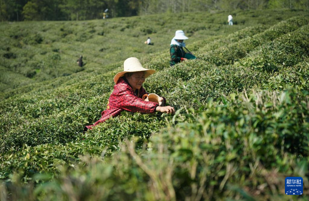 江西省修水縣漫江鄉的寧紅茶制茶基地茶園中,茶農在采摘鮮葉(3月28日攝)。