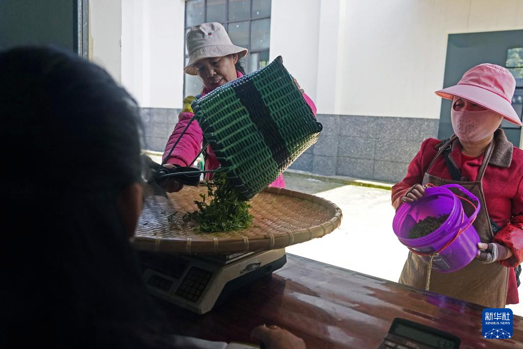 江西省修水縣漫江鄉的寧紅茶制茶基地,茶農將采摘的鮮葉交給制茶車間稱重(3月29日攝)。
