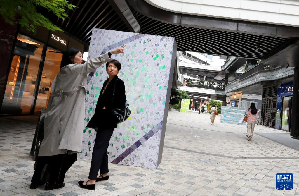 4月26日,在上海前灘太古里,市民在主題為“眼觀城市”的影像裝置藝術展品旁交流。
