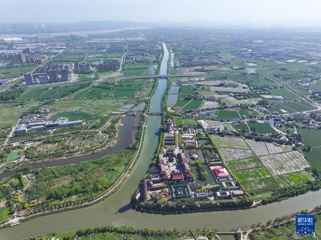 位于揚州邗江區瓜洲鎮的高旻寺和大運河風光(無人機照片,4月24日攝)。
