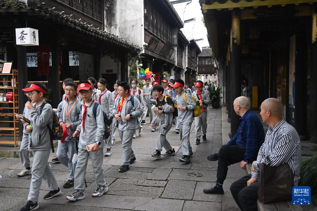 4月26日,小學生在月河歷史街區參加研學活動。