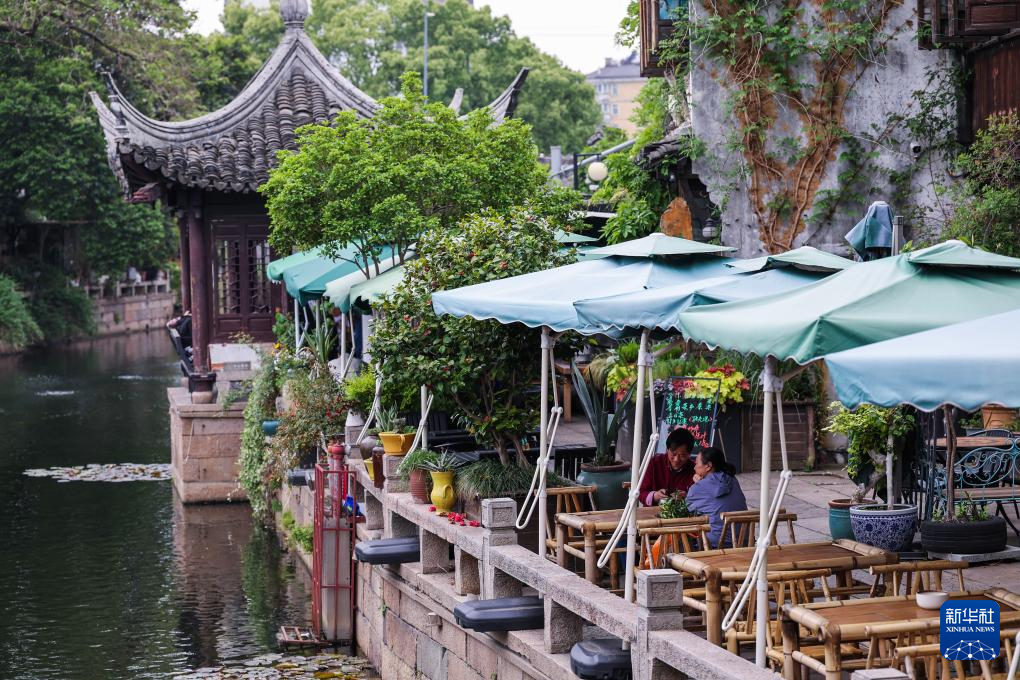 4月26日,游客在月河歷史街區河邊喝茶休息。