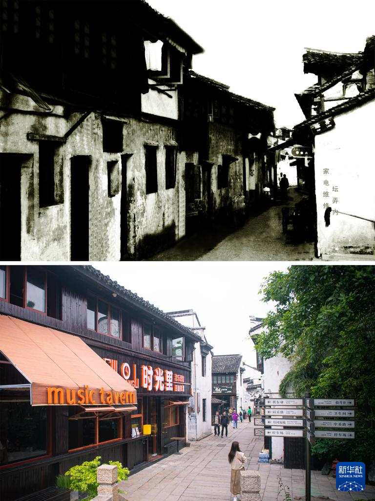 拼版照片:上圖為1979年的嘉興市月河歷史街區小豬廊下(資料照片,龐藝影攝);下圖為4月26日拍攝的嘉興市月河歷史街區小豬廊下(新華社記者江漢攝)。