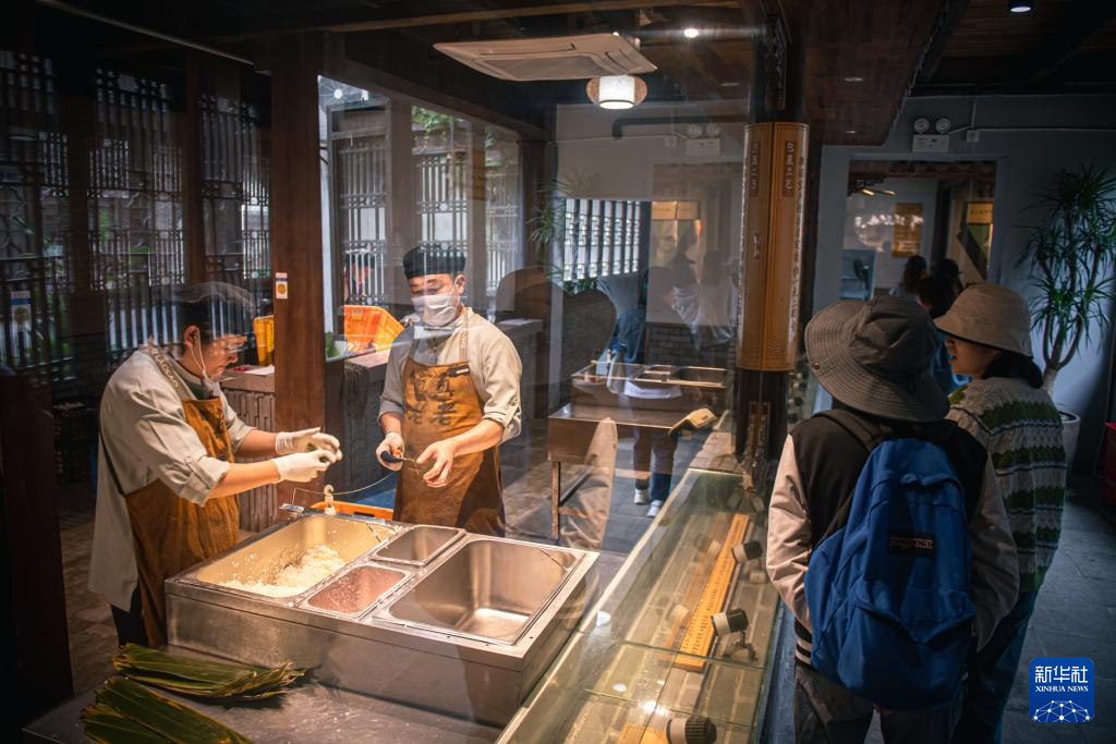 4月26日,游客在嘉興市月河歷史街區嘉興粽子文化博物館參觀粽子制作過程。