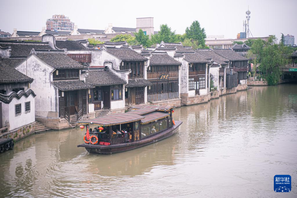 4月26日,游船行駛在流經嘉興市月河歷史街區的京杭大運河上。