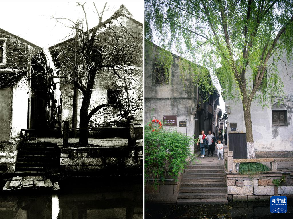 拼版照片:左圖為1979年拍攝的嘉興市月河歷史街區蒲鞋弄北岸(資料照片,龐藝影攝);右圖為4月26日在同一地點拍攝的照片(新華社記者江漢攝)。