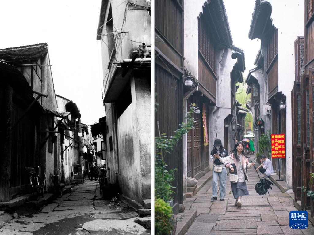 拼版照片:左圖為1979年的嘉興市月河歷史街區蒲鞋弄(資料照片,龐藝影攝);右圖為4月26日,游客在嘉興市月河歷史街區蒲鞋弄游玩(新華社記者 江漢 攝)。