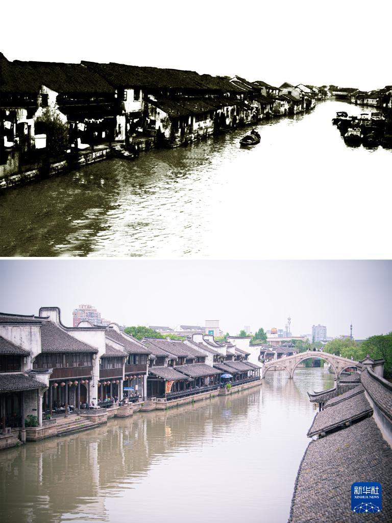 拼版照片:左圖為1979年的嘉興市月河歷史街區北麗橋口(資料照片,龐藝影攝);右圖為4月26日拍攝的嘉興市月河歷史街區北麗橋口(新華社記者江漢攝)。