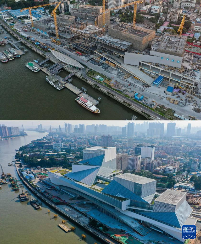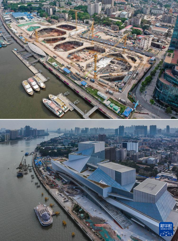 拼版照片:上圖為基坑施工階段的白鵝潭大灣區藝術中心(新華社發,2021年3月26日攝);下圖為即將竣工的白鵝潭大灣區藝術中心(新華社記者劉大偉2023年12月27日攝)。