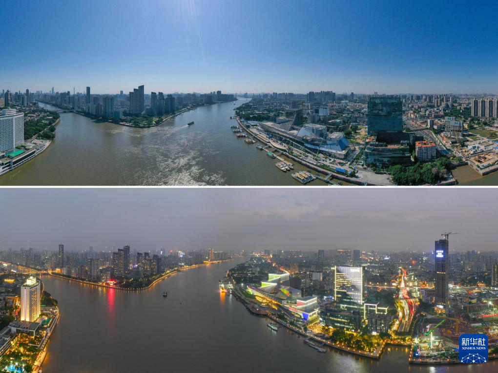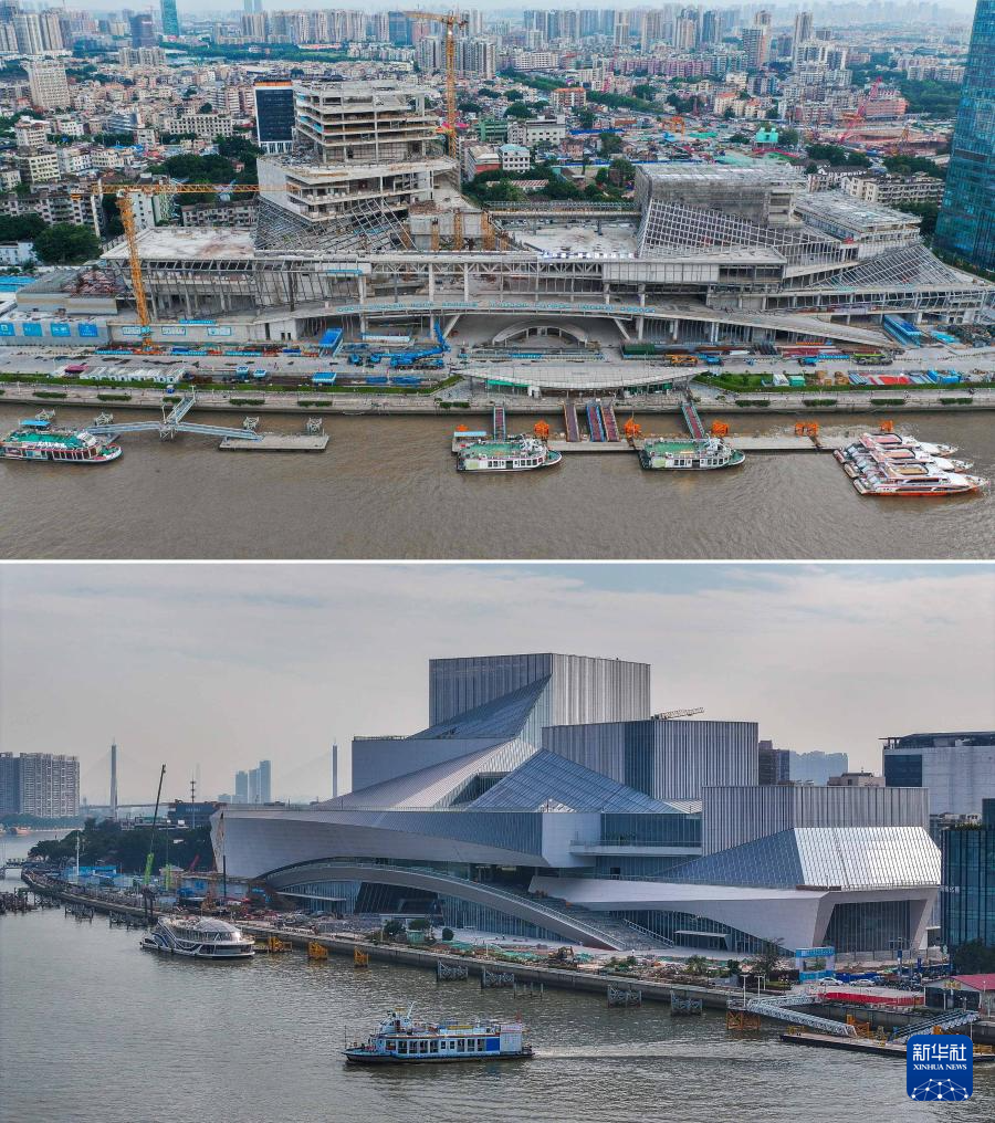 拼版照片:上圖為鋼結構施工階段的白鵝潭大灣區藝術中心(新華社發,2022年7月21日攝);下圖為即將竣工的白鵝潭大灣區藝術中心(新華社記者劉大偉2023年12月27日攝)。