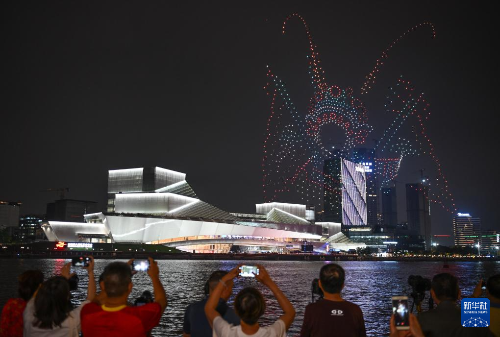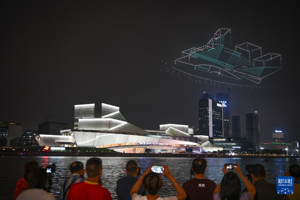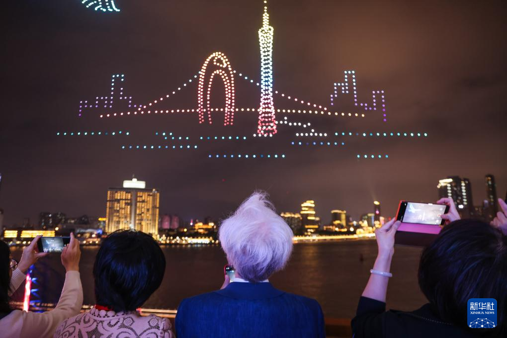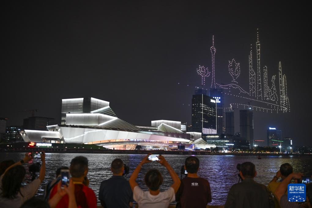 4月28日,市民在廣州洲頭咀碼頭隔江觀賞白鵝潭大灣區藝術中心無人機表演。