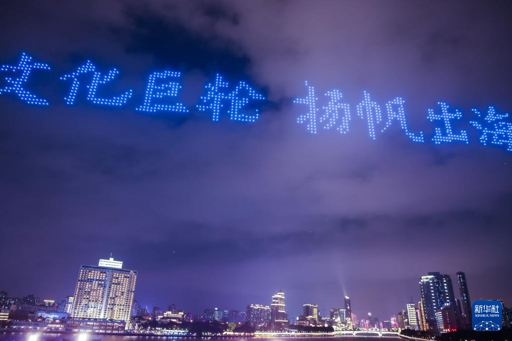 4月28日拍攝的白鵝潭大灣區藝術中心無人機表演。