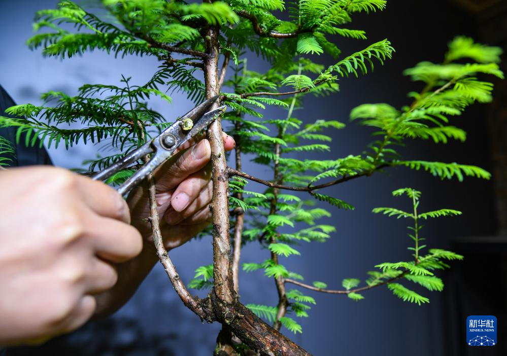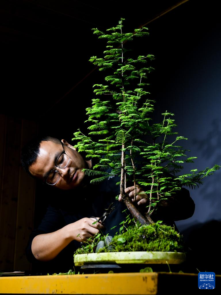 5月2日,在四川省成都市溫江區,陳宏宇在工作室對盆景進行修枝。