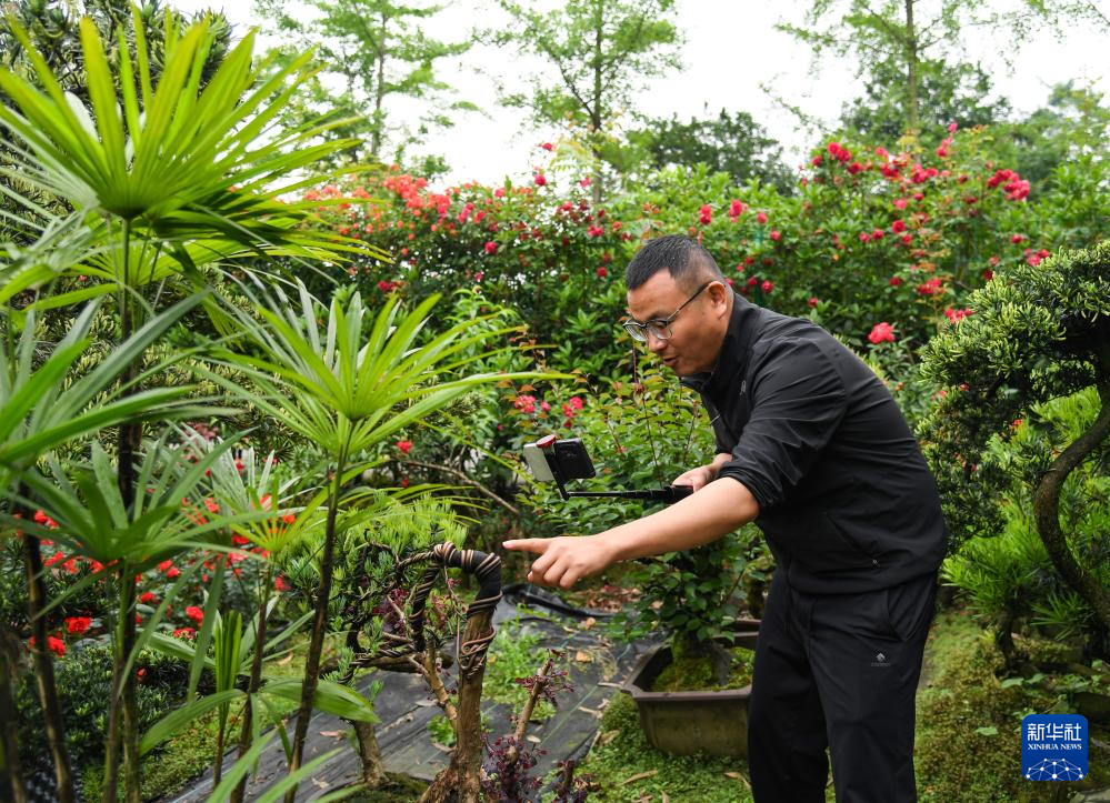 5月2日,在位于四川省成都市溫江區的川派盆景游學體驗基地,陳宏宇通過手機直播向網友介紹盆景相關知識。