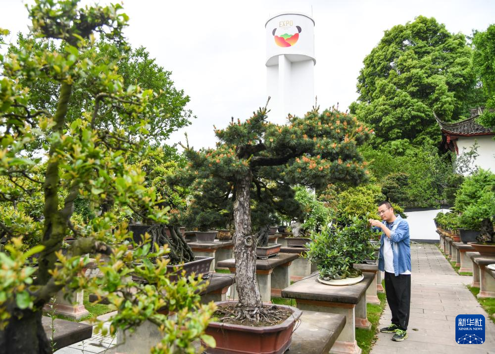 4月23日,在成都世園會溫江分會場,陳宏宇在查看展出的盆景枝葉情況。