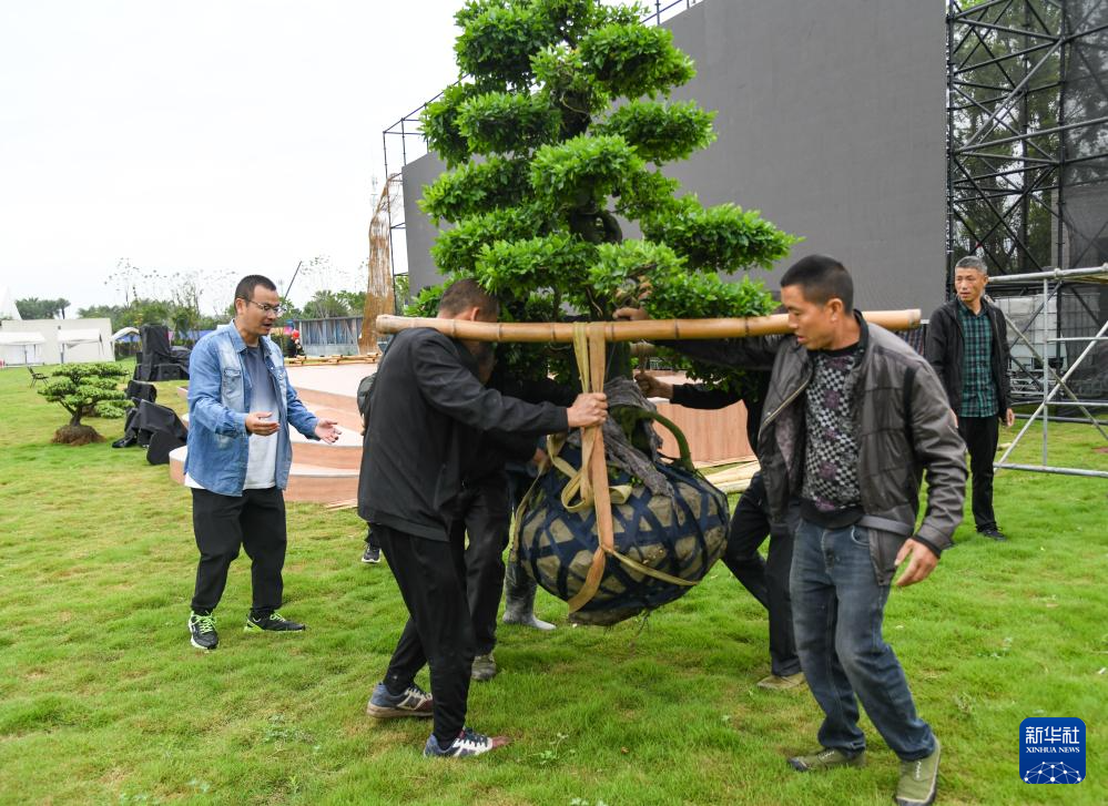 4月23日,在成都世園會溫江分會場,陳宏宇(左一)指揮工人搬運用于裝飾主舞臺的大型盆景。