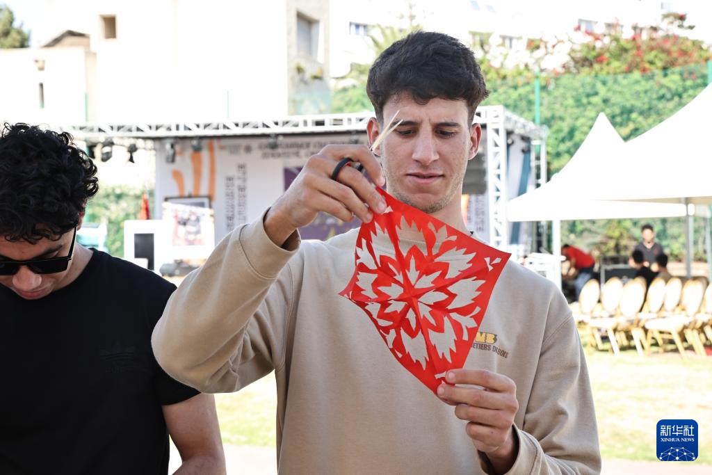 5月8日,在摩洛哥首都拉巴特,摩洛哥青年體驗剪窗花。