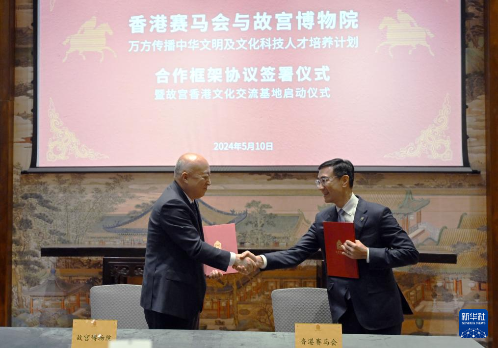 當日,香港賽馬會與故宮博物院合作框架協議簽署儀式暨“故宮香港文化交流基地”啟動儀式在北京故宮博物院舉行。根據協議,由香港賽馬會和其慈善信托基金共同成立的公益慈善研究院將資助約3.71億元人民幣,支持故宮博物院于2024年至2028年開展“萬方傳播中華文明及文化科技人才培養”計劃。該計劃涉及古建修繕、展覽展示、人才培養、學術交流、考古研究、社會教育等方面。