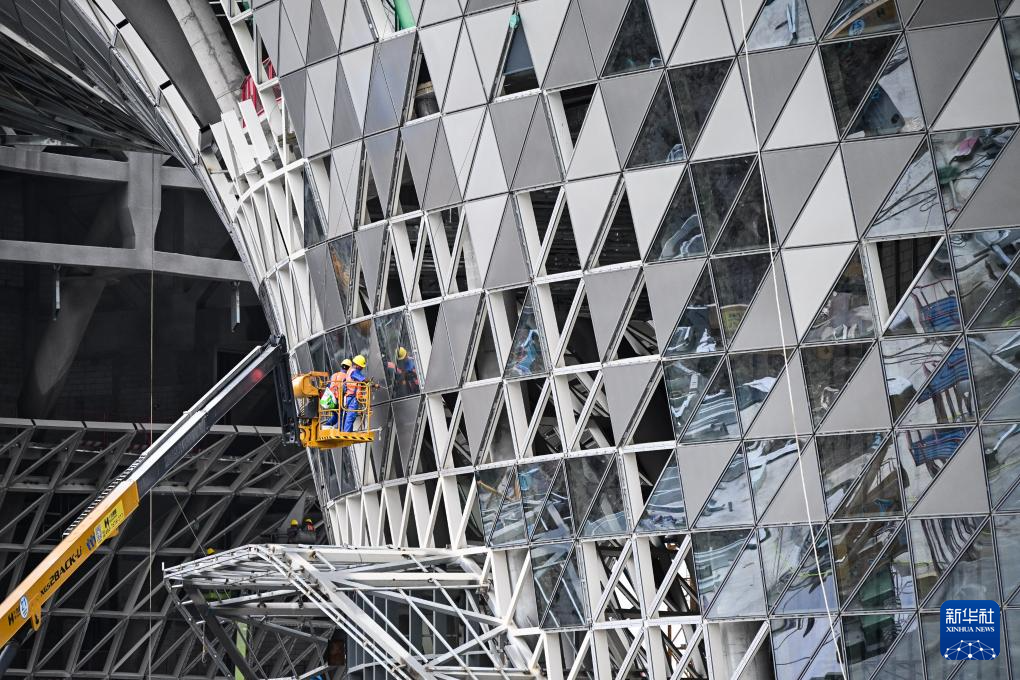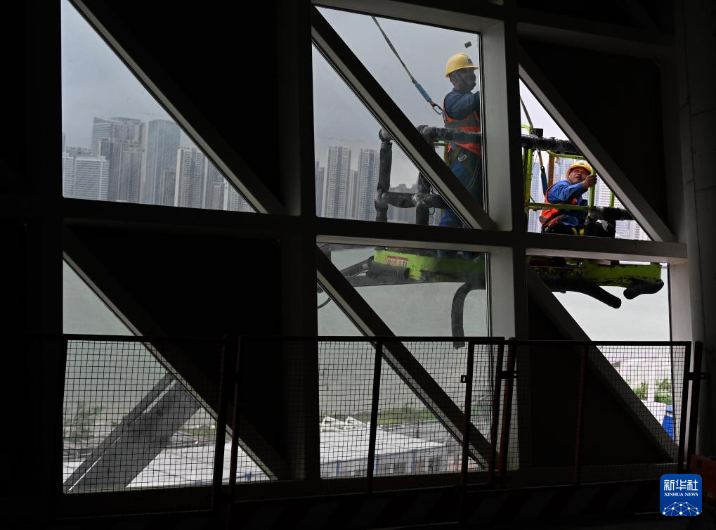 5月10日,中建深裝建設者在湛江文化中心進行幕墻施工。